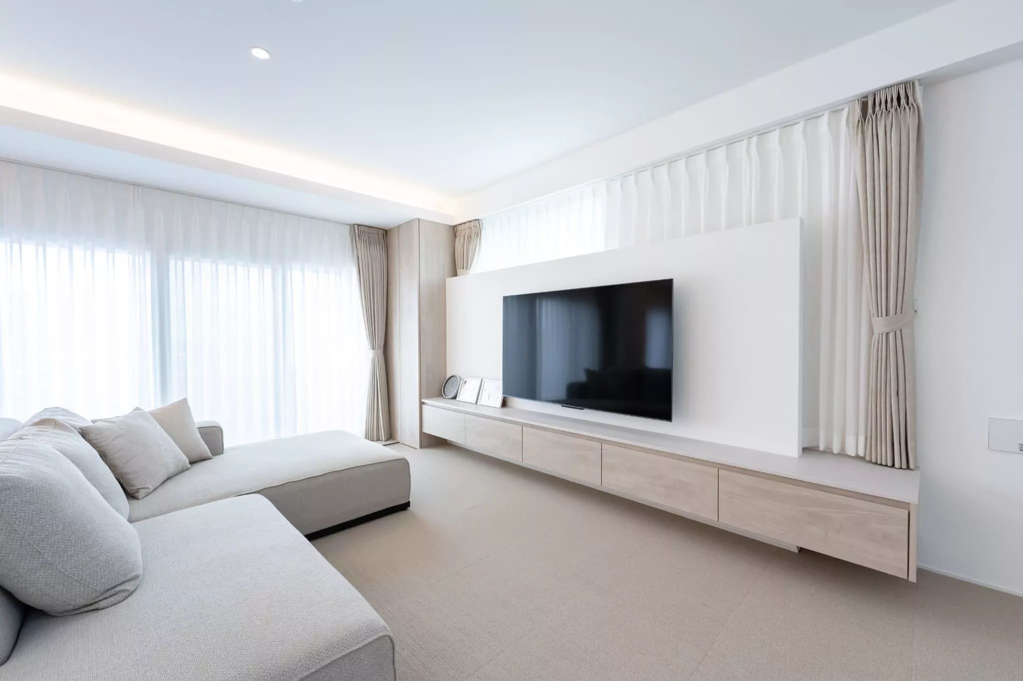 全体をグレートーンで統一しつつ、光の演出で空間に表情を加えました。構造上残る梁は、間接照明を仕込むことで折り上げ天井のようにアレンジ。窓一面にかけたレースカーテンが、やわらかな光を取り込みます。真鍮のアクセントや木の質感を重ね、冷たくなりすぎない上質なホテルライク空間に仕上げました。
